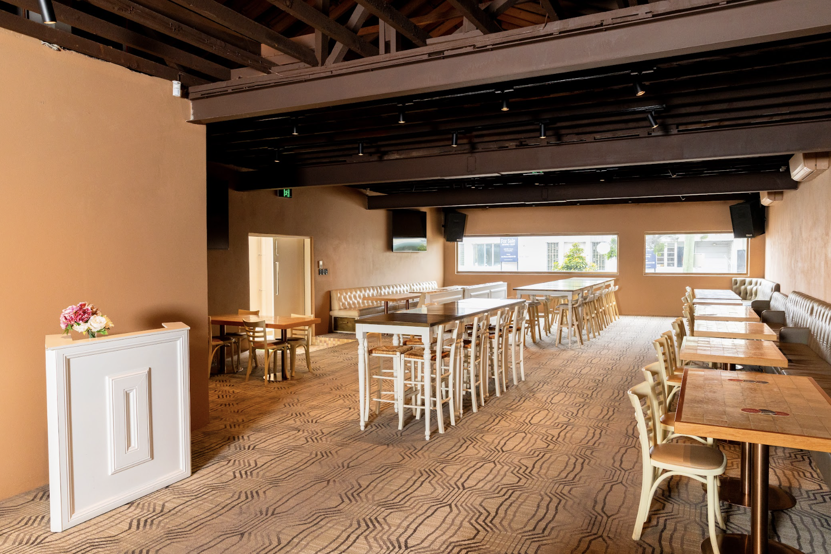 Available in this space indoor room with tables & chairs; conjoined outdoor terrace with seating; large TVs with USB input; music input via Bluetooth; table service via Me&U.